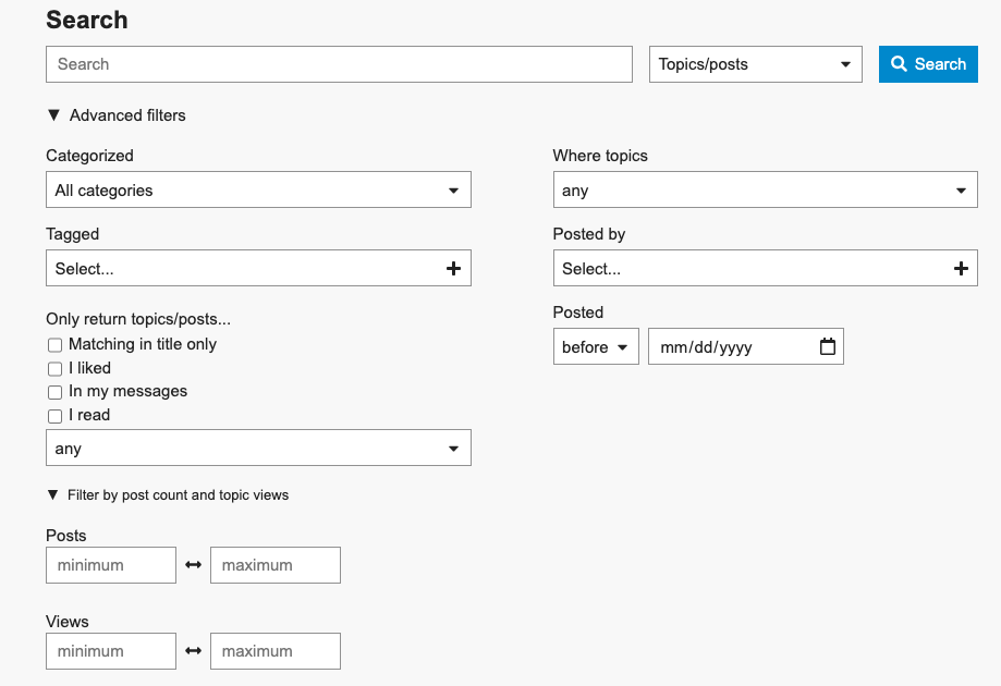 Discourse is first and foremost, a recent evolution of classic internet forums, so saving the community's conversations for all of eternity is kind of the point. As a result of this focus, Discourse is still miles ahead of say something like Slack that literally deletes your messages after 90 days. Despite having all of the information available, the functionality to actually retrieve it in Discourse is just getting by. The best way to use search in Discourse is to make sure that all of your community members and moderators are diligent about proper categorization and tagging of posts. After that, you are left to rely on remembering keywords and mentions in the posts or topics that you are looking for.