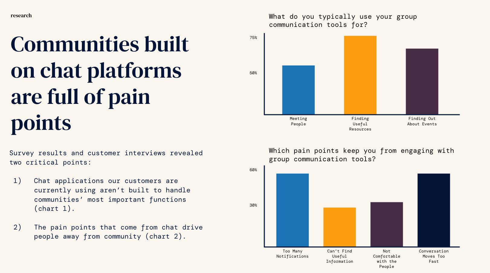 If you have a community of 100 active users and a large community tools budget you may feel this problem slightly less acutely. Slack search works, but many members we have spoken with complain about needing to know exactly what was said to find a relevant thread or conversation.