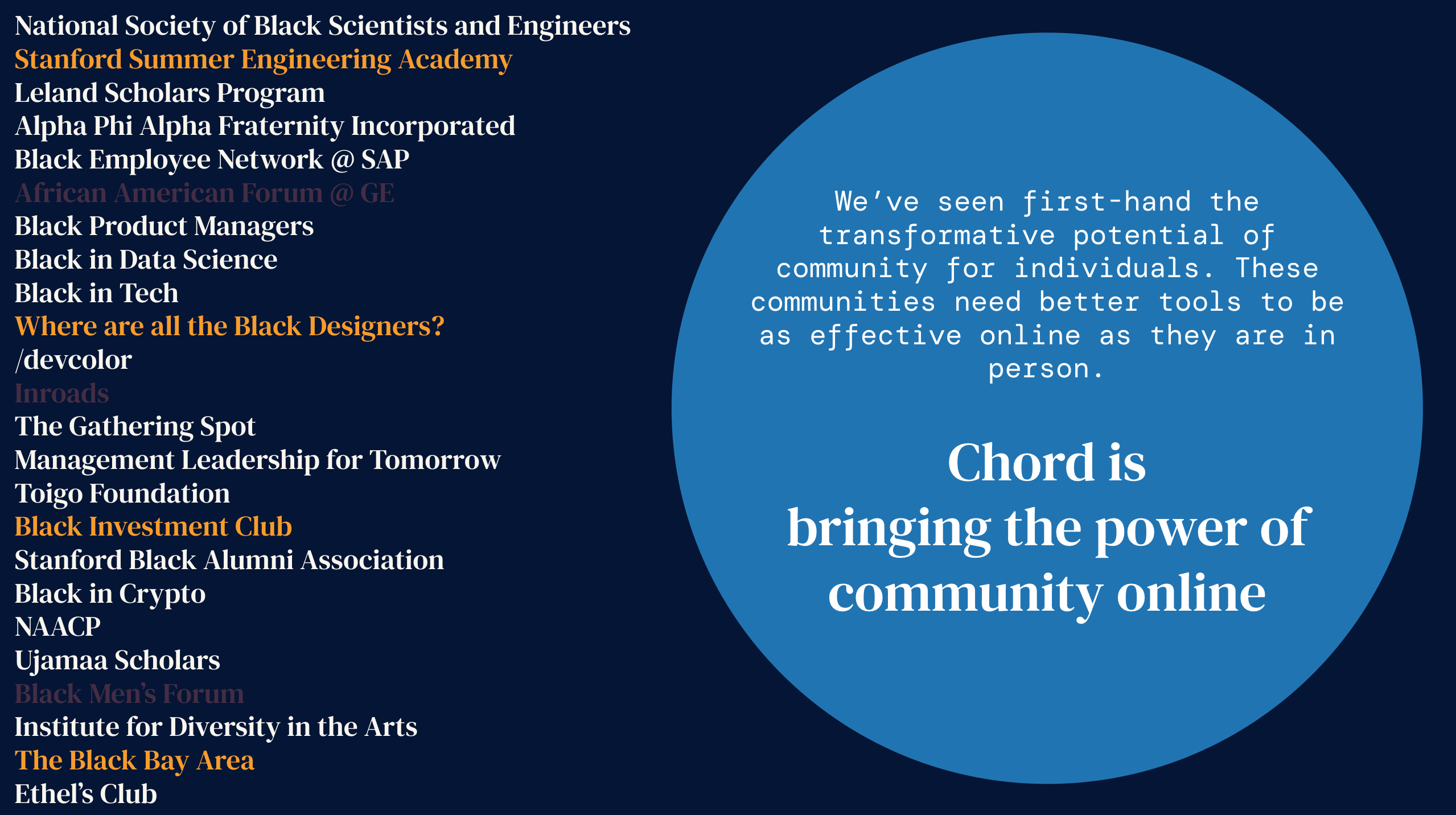 We started Chord because of the pivotal role that Black community groups have played in our lives throughout our college years and careers at large companies like GE & SAP. As Black people navigating these White-dominated spaces- communities of like minded people who shared our cultural heritage have been crucial to our success and sense of belonging.